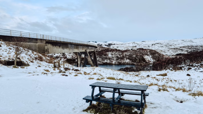 Our hope was to get to a park up near Fainmore near a weather station, it is only used for walkers and has some stunning views, but on arrival we couldn’t access due to where the plough had pushed all of the snow to the entrance. We pulled over across the road from Corrieshalloch Gorge to look at the map and reconsider our options (this is the stressful part, when plans don’t work). We agreed that our safest option for a good nights sleep was to head to Ullapool.